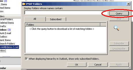 12. In the IMAP Folders window click on the 'Query' button to get a list of all of the folders that you can access. This is also know as subscribing to an IMAP folder.