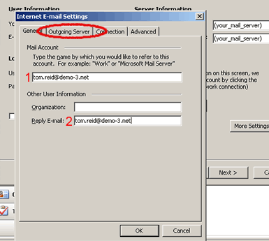 6. Enter a name for your mail account. We suggest you use your email address. Then enter your email address again for your reply email address. Click on the 'Outgoing Server' tab to continue.