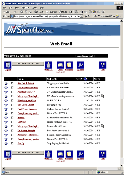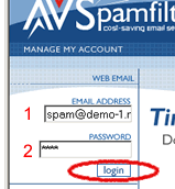 | Reviewing/Retrieving Captured Spam Email POP3 Mail Accounts Avspamfilter provides easy-to-use tools for reviewing, searching and retrieving captured spam. Using these tools you can fine tune your domain's spam preferences and add whitelist/blacklist rules to further minimize any risk of legitimate email getting misclassified as spam. For POP3 mail accounts captured spam email is automatically stored in the Spam email account for your domain (i.e. spam@your_domain.com.) After ten days spam email is automatically deleted. You can access this email account and review the contents using Outlook, Outlook Express, Eudora or other email client program. In this tutorial we'll use web email to examine the Spam account. Reviewing Captured Spam 1. At the Web Email login window on the AVSpamfilter home page enter the email address and password for your spam account. Then click on 'Login.'