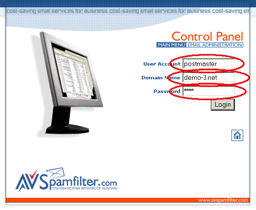 4. Enter 'postmaster' for the User Account and the your domain name and the Postmaster's password. Then click on 'Login' to login to the Email Control Panel. The Postmaster account is used the manage email for the entire domain.