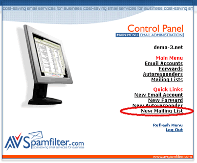 The mailing list function allows you to setup newsletter lists in which only the list owner can send mail to the list; forum-type lists in which all lists members can email and respond to the list; moderated lists in which all emails have to be approved by a moderator; digests or compilations of a day's correspondence that is sent out to digest members. We'll walk through the configuration process and how to use the more common features. Add a New Mailing List 1. Click on 'New Mailing List' in the Main Menu.