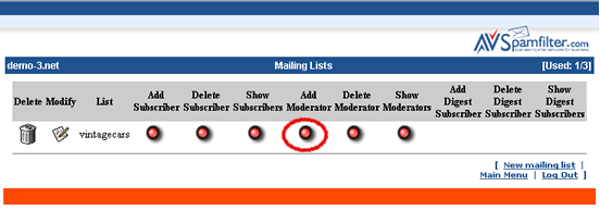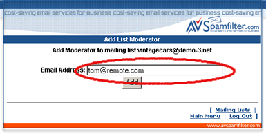 10. Moderators are the only ones that can send an email to a newsletter type list. and carry out others function defined by the list configuration. To add a moderator click on the 'Add Moderator' button for the list.