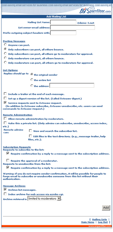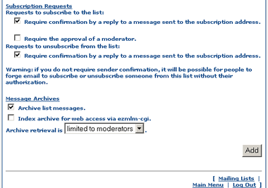6. Subscription requests. Be sure to require either a confirmation or moderator approval for all subscribe and unsubscribe requests. That will insure that people are not subscribed to lists they had no interest in joining. Message Archives. If you want messages archived check this box. Don't check indexing since we don't support the ezmlm-cgi. Please read the ezmlm manual at the above link for more information on archiving. Be sure to click on the 'Add' button when you're finished.