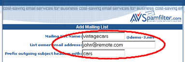 3. Start by entering the email address of the mailing list, such as 'vintagecars'. Be careful not to repeat a name already being used as an email account, forward or autoresponder. Next enter the list owner's email address. Then enter any subject line prefix you may want to use. This prefix will be inserted at the beginning of subject line of all emails sent to list members and will alert list members that an email is from the list and not unidentified junk mail.