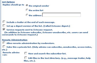 5. List Options. Replies are only relevant for forum type lists. In this case if you think the replies to postings will be of interest to all list members then select 'the entire list'. Otherwise replies can just go to the 'original sender.' For information on adding a trailer, retrieving a digest version of the list, controlling the list via email commands and remote administration please see the EZ-MLM manual at http://www.ezmlm.org/ezman-0.32/index.html