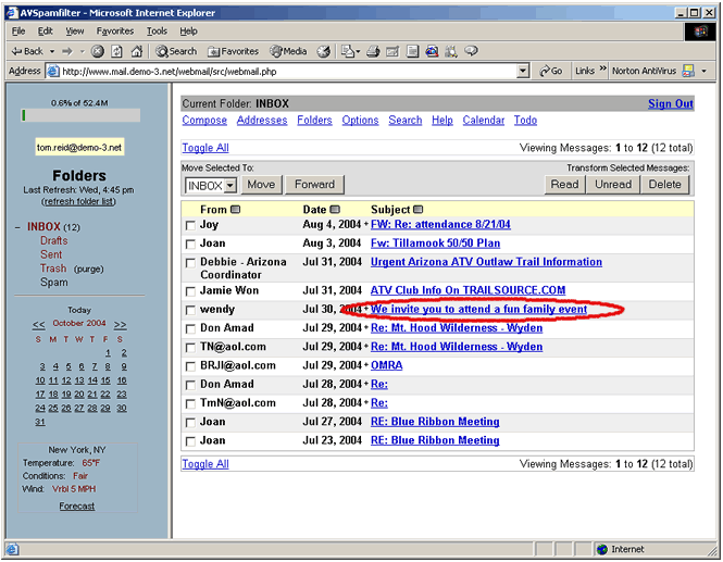 a snapshot of the main IMAP web email screen. In the left-hand window