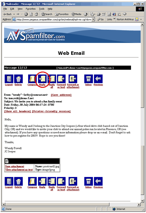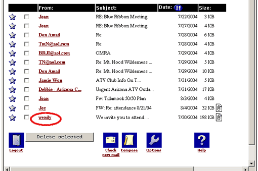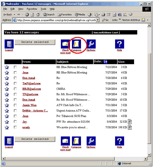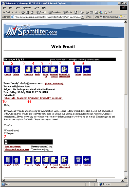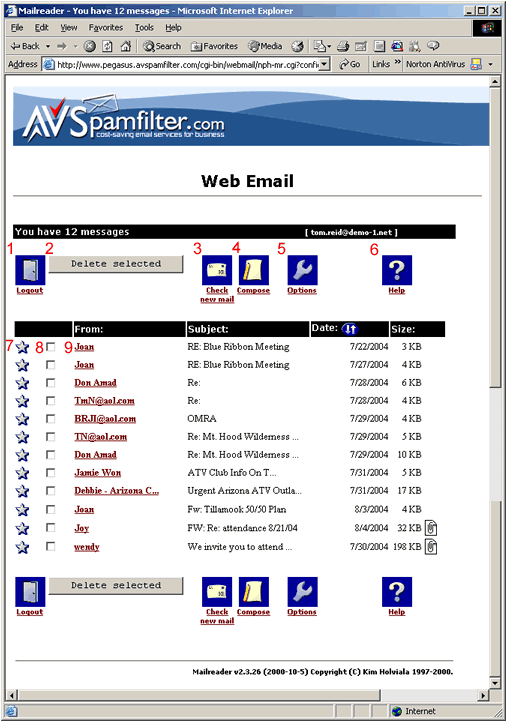 a snapshot of the main POP3 Web Email screen. We've numbered the major